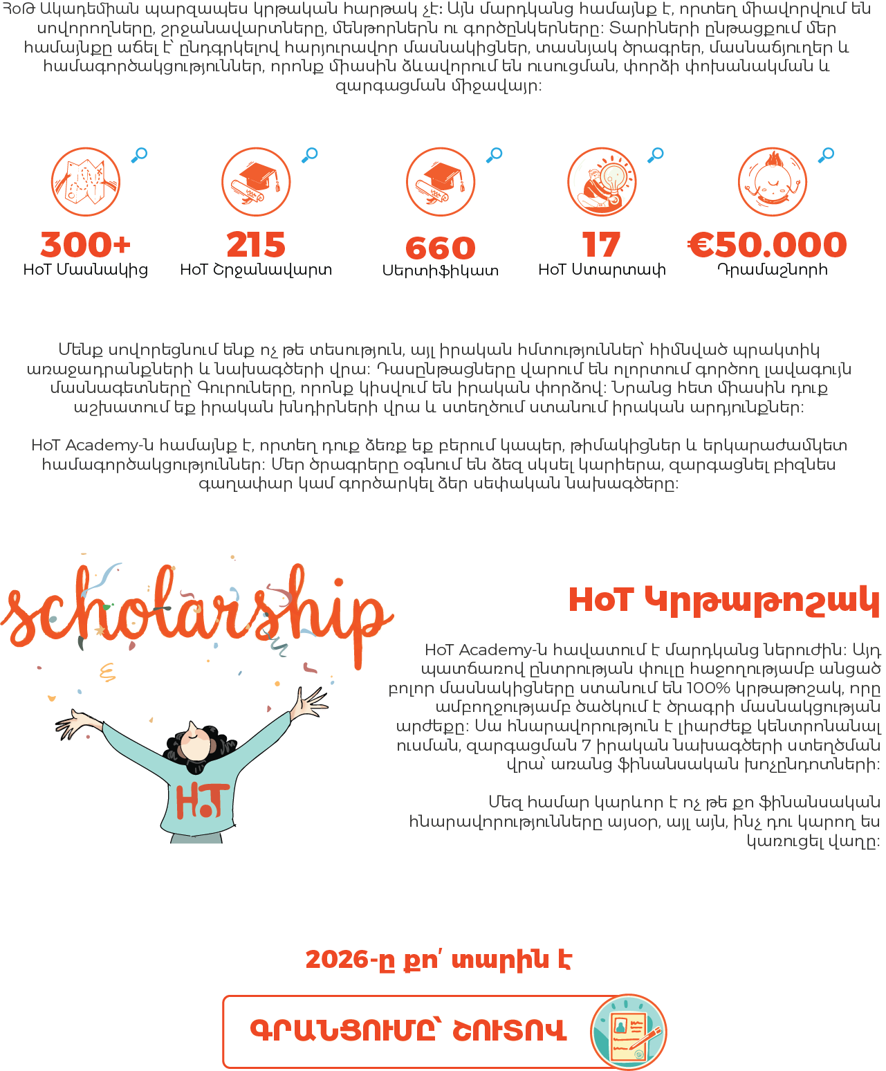 ՀօԹ Ակադեմիան սկսում է 2-րդ կրթա։ Մեր առաջին քայլերը ապացուցեցին, որ հայ երիտասարդի ներուժն անսահման է։ Հարյուրավոր շրջանավարտներ, իրականացված բիզնես գաղափարներ և ձևավորված ամուր համայնք։ Այսօր այս հաջողությունը վերածվում է նոր ու ավելի մեծ առաքելության։