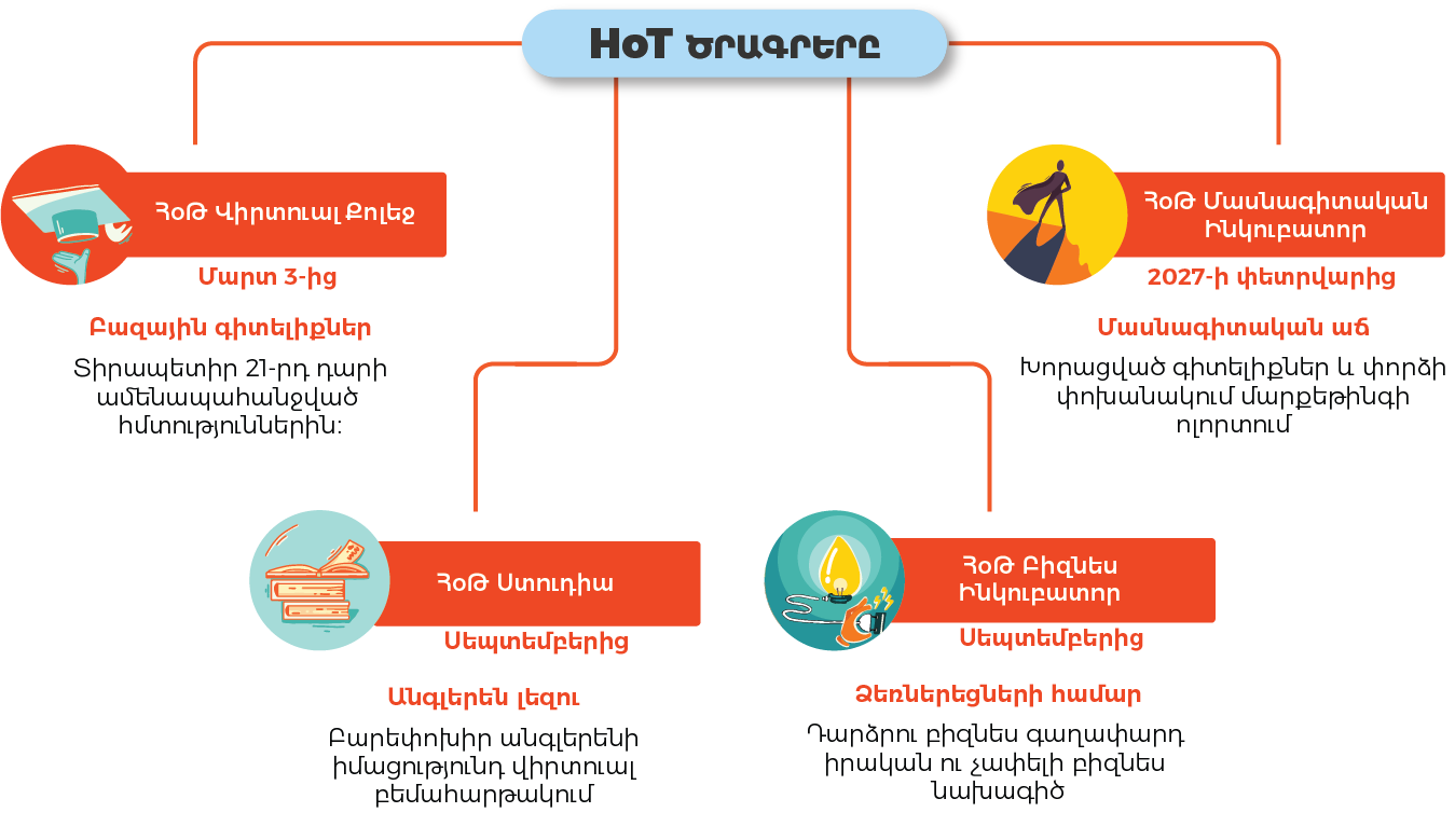 HoT Ակադեմիան նորարարական ոչ ֆորմալ կրթական հարթակ է, որի նպատակն է երիտասարդներին զինել կիրառական հմտություններով, ձեռնարկատիրական մտածելակերպով և աշխատաշուկայում արդյունավետ գործելու տեսլականով՝ համահունչ զարգացող շուկայի պահանջներին։